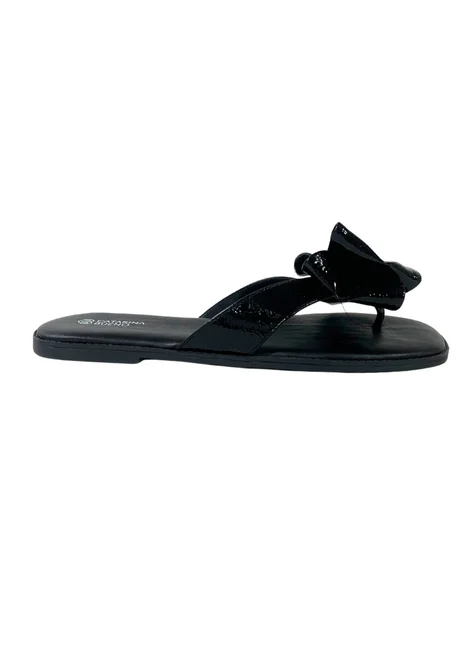 Chinelo de dedo com detalhe em laço de verniz sobre o peito do pé.