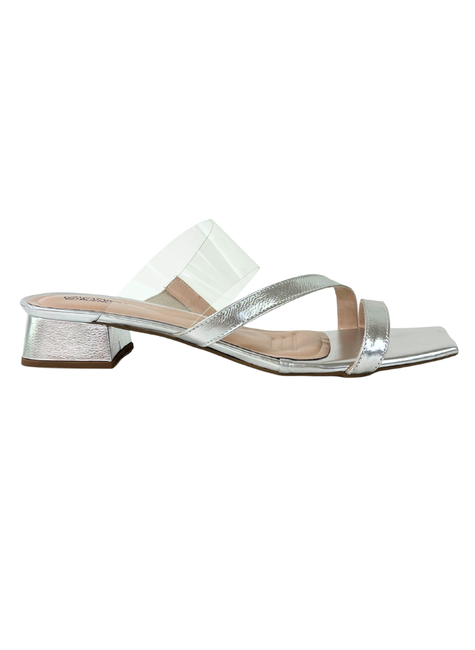 Tamanco super descolado, com tira em vinil sobre o peito do pé.