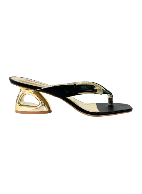 Tamanco com tiras finas sobre o peito o pé, com fivela dourada metálica de enfeite.